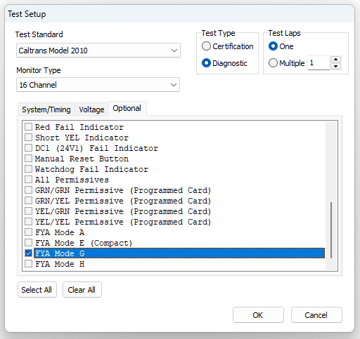 - For this example, we're only testing the FYA Mode G, but you could add this to your certification by clicking on Run Optional Tests.